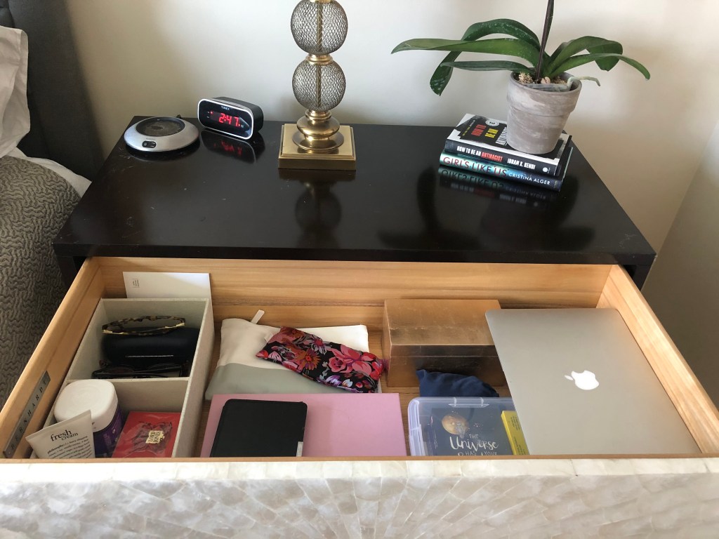 Since we downsized from our suburban house to a city condo a few years ago, I don’t have much personal space. My bedside table drawer is loaded with intimate objects, many of which are definitely embarrassing. Or maybe not. Doesn’t everyone have meditation crystals, CBD gumdrops and lube in reach of their pillow? While most of the stuff I had in my drawer was personal, it wasn’t all inspiring or necessary. If you’d like see everything I started with, take a peek at this quick video—or just scroll down to see the before-and-after pics.