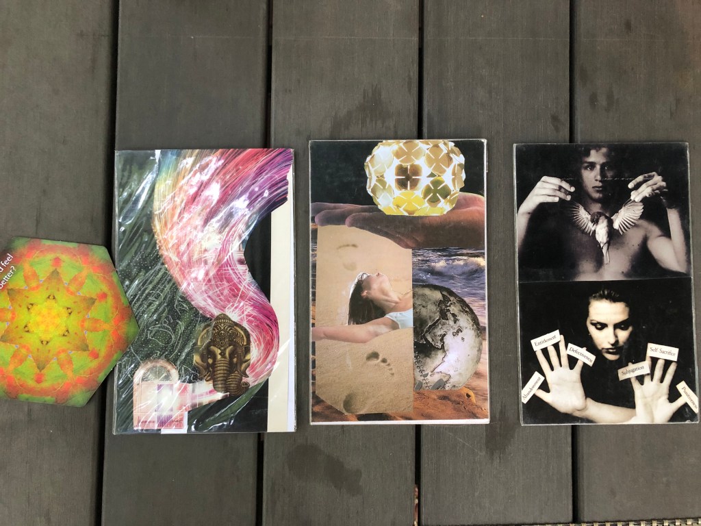 Making my first SoulCollage cards was fun and effortless. It was so satisfying to use scissors and a glue stick to create these appealing little works of art. I was surprised when Kathy told us an hour had passed. I had only made three cards and was really getting into it. Here they are: