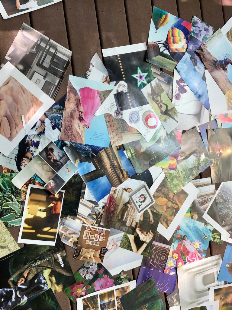 As planned, Laura and I drove to Kathy Bresler’s woodsy retreat in Indiana to meet on her screened porch for an introduction to SoulCollage. (You can learn all about Kathy in our prior post, she’s definitely someone you’d want to spend an afternoon with.) We were greeted by a river of dramatic and appealing images, cut from magazines, flowing over the porch floor. Kathy invited us to pick 5-7 photos without thinking too much about it. We used them to create the first cards of our SoulCollage deck.