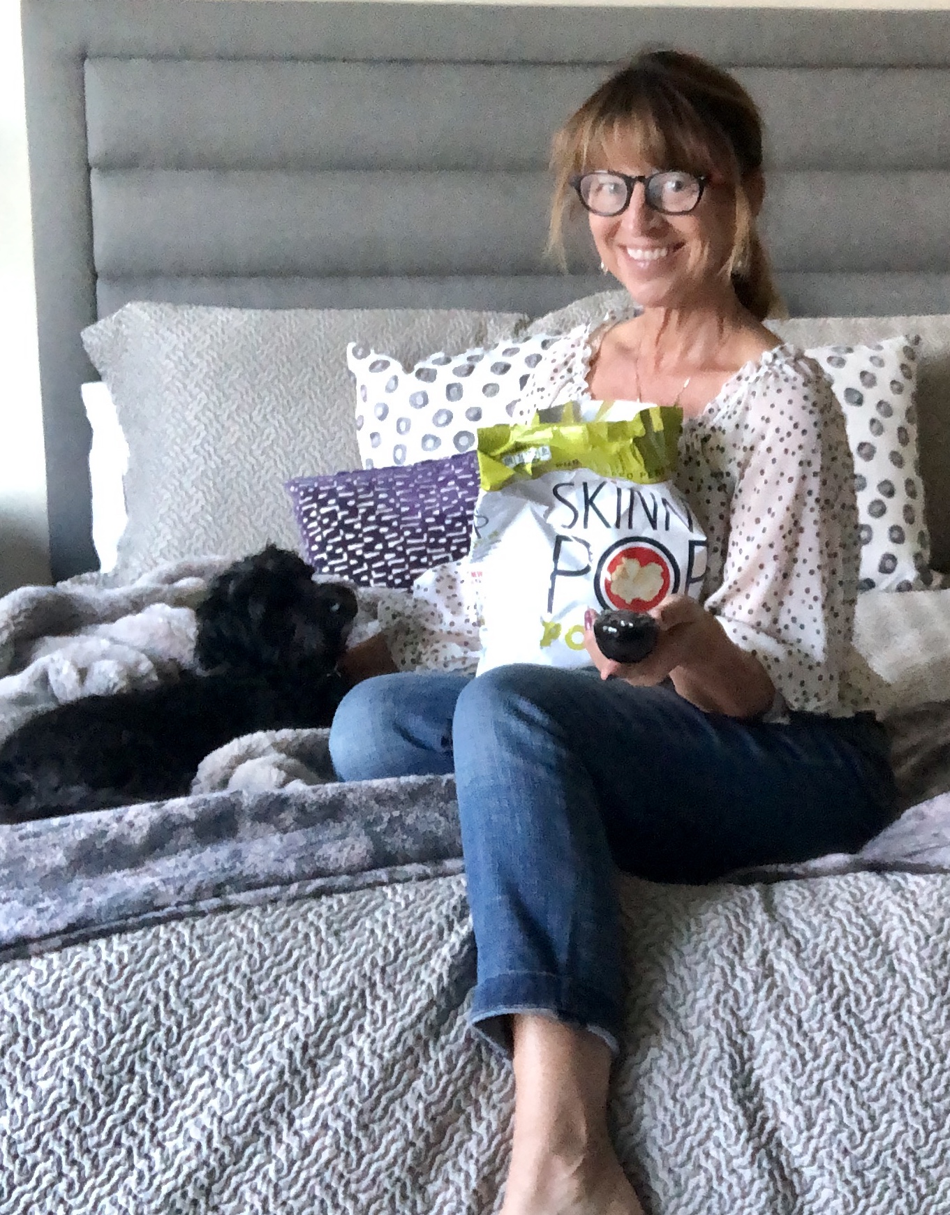 This week I got my wish, and now I have a couple nights to do exactly what I want, when I want. Let the wanton self-indulgence begin. Dinner consists of buttered noodles and salad at 5pm while watching funny YouTube videos and guffawing with a mouth full of spinach. Then it’s time to beautify—take a Epsom salts bath, do my nails, whiten my teeth, get out the magnifying mirror and pluck a few random hairs off my face. I just potter around, do a little reading, maybe write in my journal. When it gets late, I don’t have to tiptoe around my sleeping husband. I can take a bag of crunchy snacks, a glass of wine and the puppy over to his side of the bed and watch Dead to Me or Outlander until I fall asleep. Little stuff, but it’s a luxury to indulge freely in my whims and desires without having to consider the needs of my mate. When Liam gets back I know we’ll be thrilled to see each other. Although he may not appreciate the popcorn kernels under his pillow.
