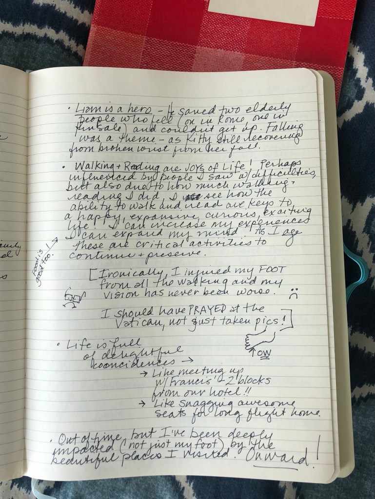 Set Goals. A journal is a great place to clarify what’s important to you and make a plan for making it happen. Whether it’s gearing up for a big new project or simply planning my day, I find writing in my journal helps me get organized and stay motivated. Here’s a page I wrote in 2015 when Liam and I were in Rome and I realized that that walking and reading are the true joys of life.