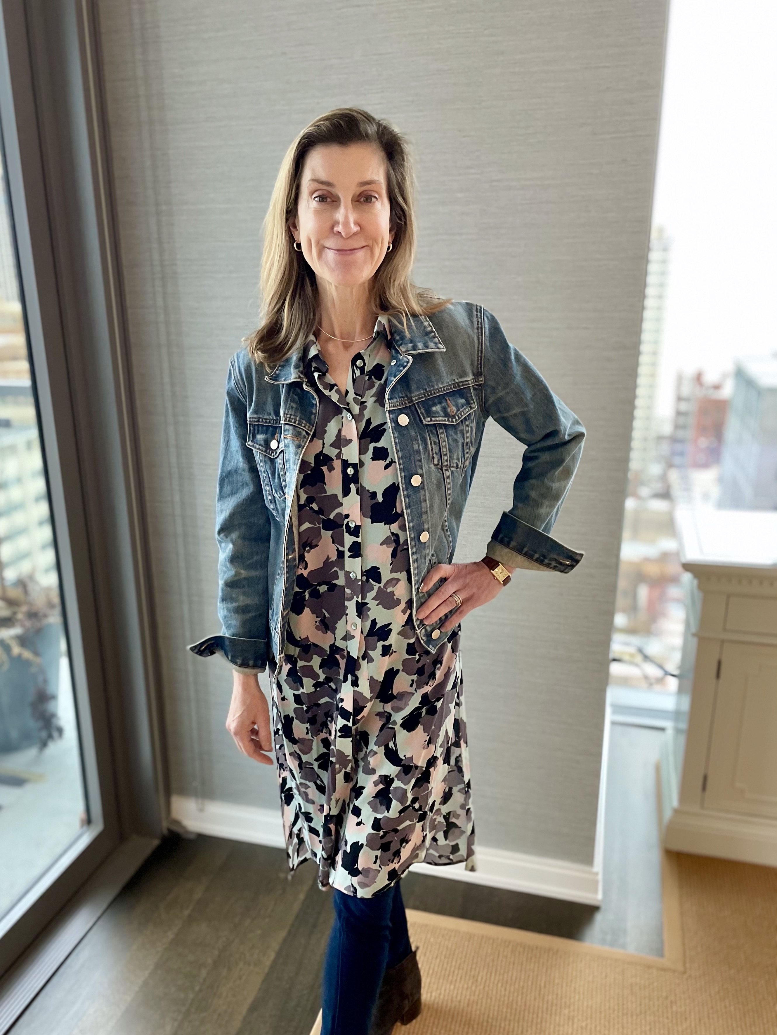 The first look is with white jeans, classic. Then I paired it with a stretchy black skirt and white boots. If you’re younger than I am, you could swap the skirt for the very on-trend black bike shorts. Finally, it’s not warm yet, so I wanted a look that added a layer and the dark and light denim seemed not too matchy-matchy.