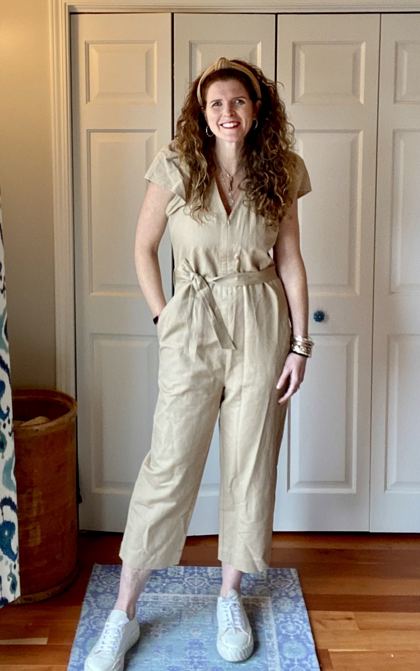 Annie went for a neutral look with this adorable romper from Rebecca Minkoff, which was on sale for $104. She jazzed it up with accessories to take it from cooler temps into warmer weather. It’s also that great addition to a wardrobe that can go from a dressier day at the office to a weekend brunch. And how cute is that headband? Love it!