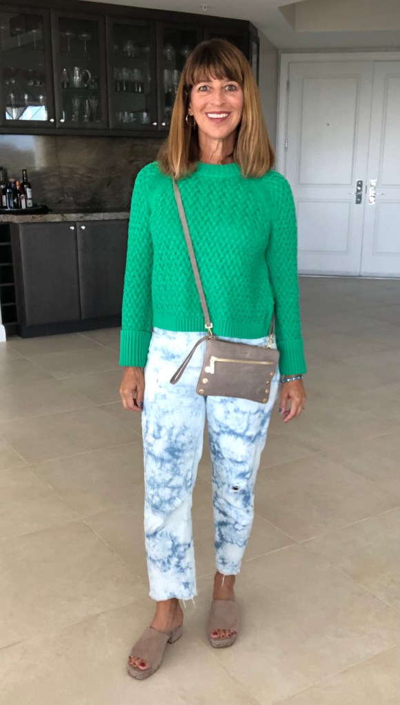 Annie told us that mixing a silky skirt with sneakers is in right now, as are acid washed jeans (hello ’80s). I used versions of both to create my first two looks. Annie suggested I tuck the sweater in—I’ll try that next time. For my third look I broke up the green by pairing it with a crisp white blouse and rolled up the sleeves.