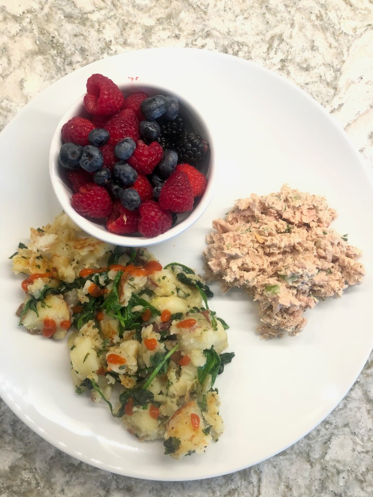 Monday— Fretted about what to eat before my tennis match instead of my usual peanut butter toast and mid-match protein bar. Had leftover potatoes, tunafish, berries and SmartWater. It was very hot and we lost the match but felt okay. Attended a team party (all of us vaccinated) and stuck to sparkling water and grilled shrimp/veggie kabobs. Resisted wine, orzo, cheese, a sugary salad, cookies and cake. It was an effort. Got a headache. Went home and complained bitterly to my husband about the ridiculously punitive diet that sucked every shred of joy out of life. Took a CBD gummy (yes, with sugar) and went to bed grumpy.
