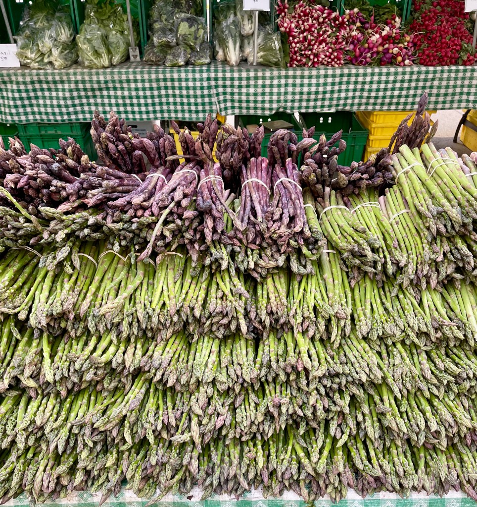 I missed the farmers’ market out on Shelter Island this past weekend because the rain had no regard for the fact that many of us had a house full of family and guests to feed. I could have braved the deluge, but didn’t! Now I’m back in Chicago, with farmers’ markets open to me throughout the week, so I went early to the Streeterville Tuesday morning market in front of the Museum of Contemporary Art. Right now, asparagus, lots of greens, herbs, rhubarb and strawberries are in season. All things I love to eat and cook!
