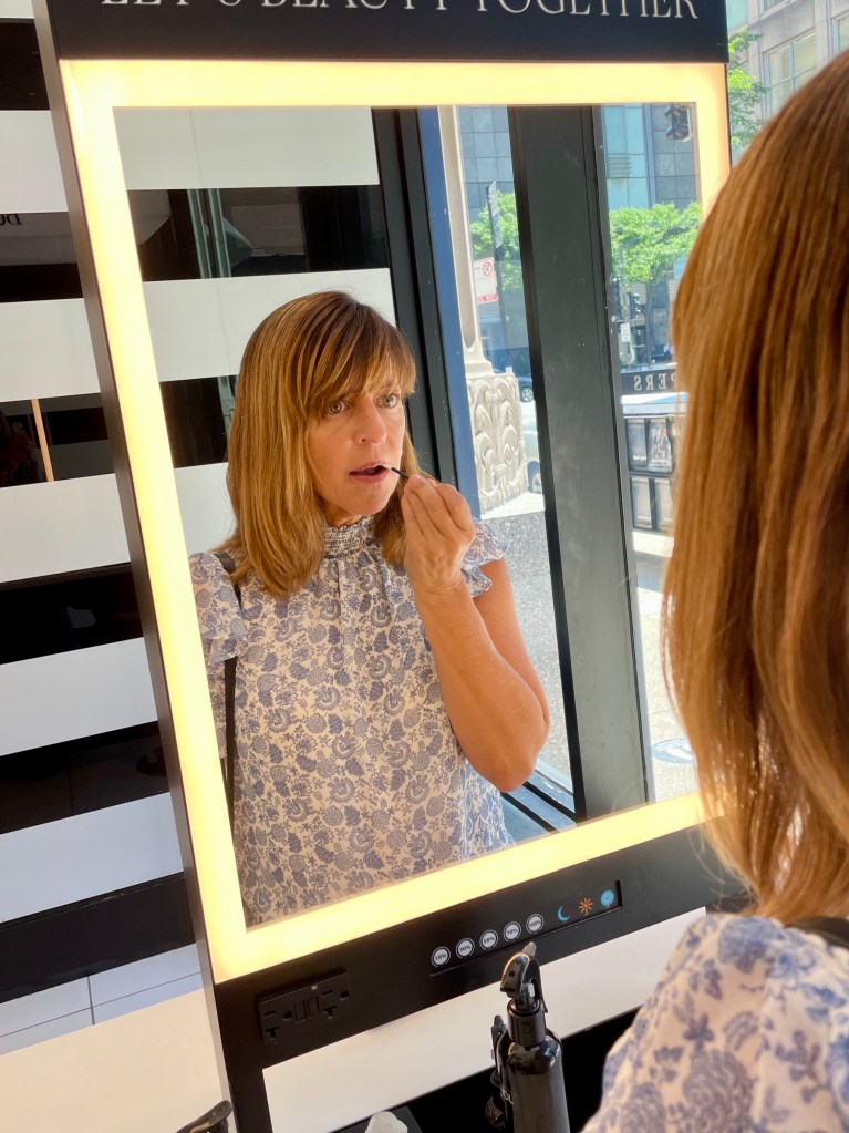 Once I finally did find my lipsticks (minus the Chanel one) I discovered that I have two KVD Beauty matte long-wearing lipsticks in Bachelorette. Too bright, no? (It’s what I’m wearing in the above photo.) Plus, assorted other lipsticks that I probably got for free at different events and rarely wear. It was time for something new! I do like a long-wearing lipstick and they’re usually matte which seems more age appropriate than a glossy gloss, but it can’t feel like chalk or leave my lips parched at the end of the day. Our adorable sales associate, Lauren, highly recommended the Charlotte Tilbury Matte Revolution Lipstick Wedding Belles and after trying a couple of shades (too light, too dark) this one was just right. I’m happy to be wearing lipstick again, but honestly, the best part was talking to the sales associate, trying on colors with a friend and sharing opinions. It was all very normal and so, so very nice!