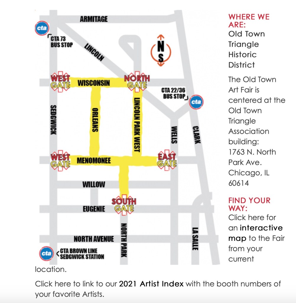 While the Old Town Art Fair is done for this year (but a roaring success—it was packed even with required timed tickets), there are many more art fairs to come in Chicago and wherever you are. Here’s a handy reference of Chicago 2021 Summer Festivals compiled by WTTW that includes suburban events (and also lists what’s not happening, which is pretty helpful).