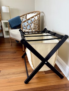 Luggage Rack. Even though the closet has plenty of empty shelves and hanging space, some of my guests prefer to live out of their suitcase. For them, a luggage rack is essential. As my friend Lisa told me, it’s awkward to access your things when your bag on the floor. I ordered this handy rack from Amazon, which also has a laundry basket underneath. It collapses to be stored in the closet or under the bed when not in use. Basic, but my guests love it.