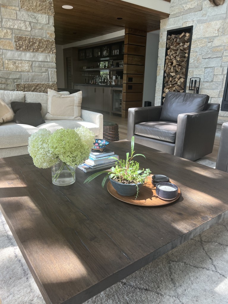 Since embarking on this coffee table challenge I’ve been paying attention to what my friends have on display. My friend Lisa O’Brien has this creation going on at her newly renovated Wisconsin lake house. Note the use of the tray, the stack of books to create levels, the variety of heights and materials, some eclectic objects and, bonus—both a plant and flowers. I give Lisa high marks, and she didn’t even read the guidelines!