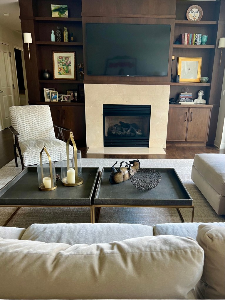 Here’s an easy, satisfying project that costs absolutely nothing: restyle your coffee table. For this challenge, I enlisted the help of my good friend Patty Myefski. She and her husband John just moved to Chicago’s Gold Coast from the North Shore (finally!) and is in the process of setting up her chic new abode. My own living room coffee table was in need of a refresh. The arrangement looked clunky and random. Especially in smaller spaces, a coffee table really becomes the focus of a room, so a thoughtfully designed table top makes a big impact. Read on to see our before and after pics and the principals we followed to achieve a pleasing look that still functions. Even with all the fussing, each table took less than 20 minutes to make over. Very fulfilling!