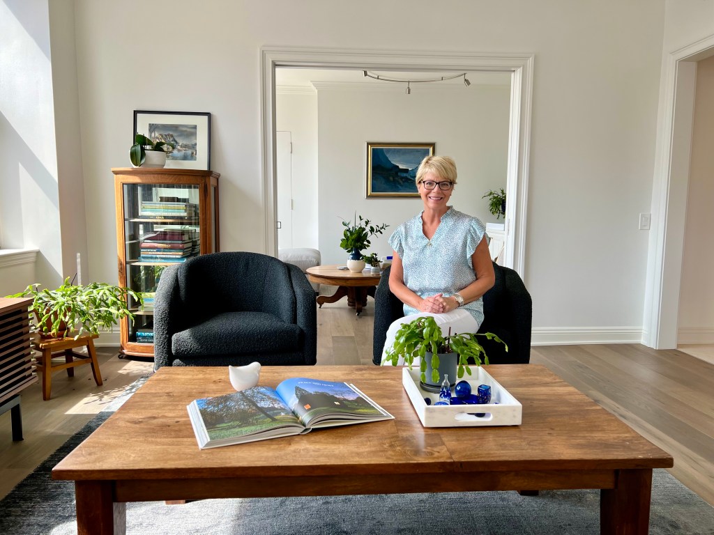 Patty moved confidently onto the second coffee table and created this pleasing arrangement on the round pedestal table within minutes. The books add height and allow the blue ceramic bowl to shine. The vintage Dala horse from Sweden is a fun accent, the coasters look cohesive and the blue and white vase with fresh greenery ties everything together. Patty is very happy with this design which complements both rooms (and doesn’t her condo have a great view?).