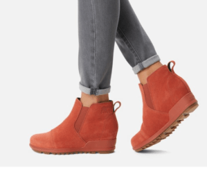 Sorrel. These boots are high on Jen’s list for winter-wear. They are waterproof, grippy and flattering, thanks to a hidden 2.5 inch wedge heel, shown here in this pull on Evie style bootie.