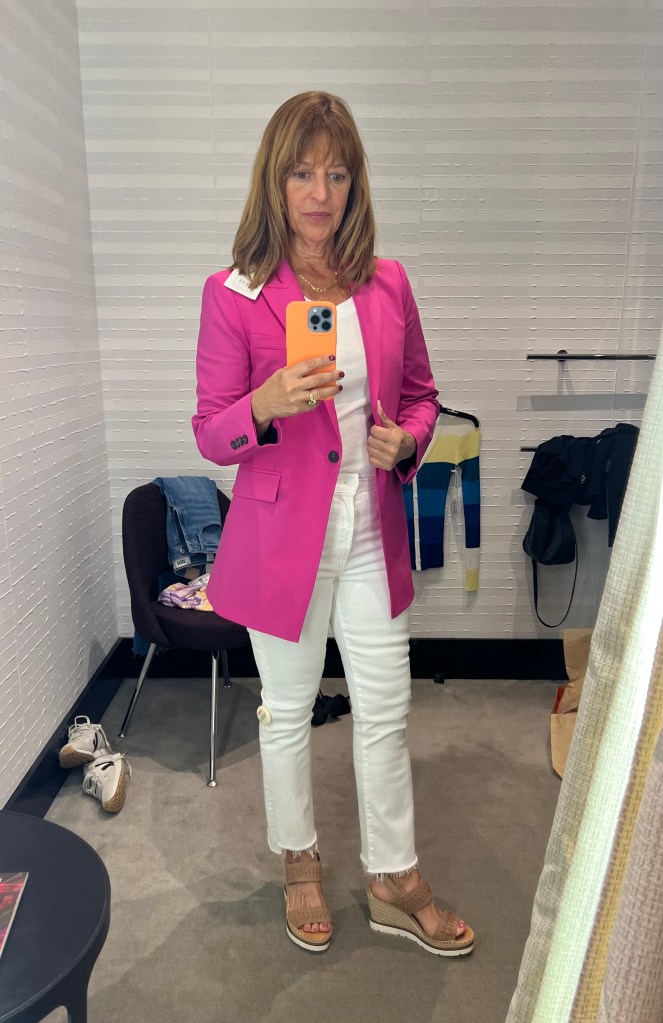 A personal shopper can help you expand your wardrobe by suggesting trends and designers you might not normally wear. They have a bigger vision for your look than you do—it’s a great opportunity to experiment. I tried on plenty of things that didn’t work out, but I ended up buying a couple pieces that I wouldn’t have thought to try, like the printed green shorts and bold pink jacket pictured below. It’s so nice to have a professional opinion in the dressing room. I love when Vince says “nope” or “it doesn’t do anything for you” because I know he wants the best for me and will help me find it. I can explore new aspects of myself and have confidence in my purchases.