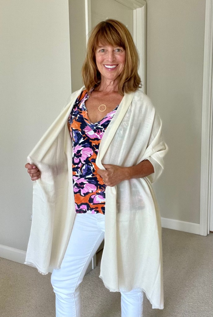I’m going to Marrakech in October and want to bring a big lightweight scarf to throw over my shoulders when modesty is required. I don’t love wearing scarves, but this is the one must-have garment all the travel experts recommend for Morocco, a Muslim country. When I saw ads on Instagram for a well-priced, feather weight silk/cashmere scarf from Quince (a company I’d never heard of) it seemed ideal. I’m super happy with it. It’s as big, light and pretty as promised and worth the $59.90 price.