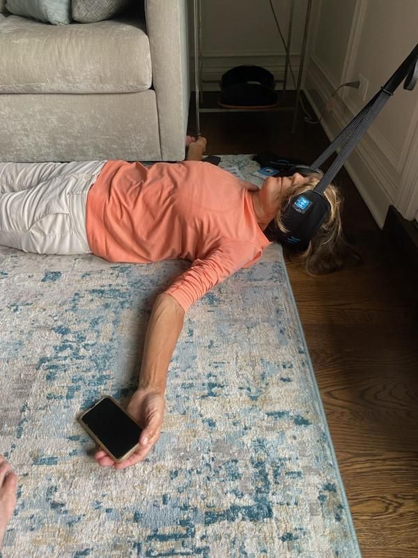 Lorraine has suffered from a compressed neck and tight shoulders in the past, but finds relief by using a neck hammock—a handy contraption that hangs from a doorknob. Lorraine lies with her head in it for 15 minutes in the morning while she meditates.