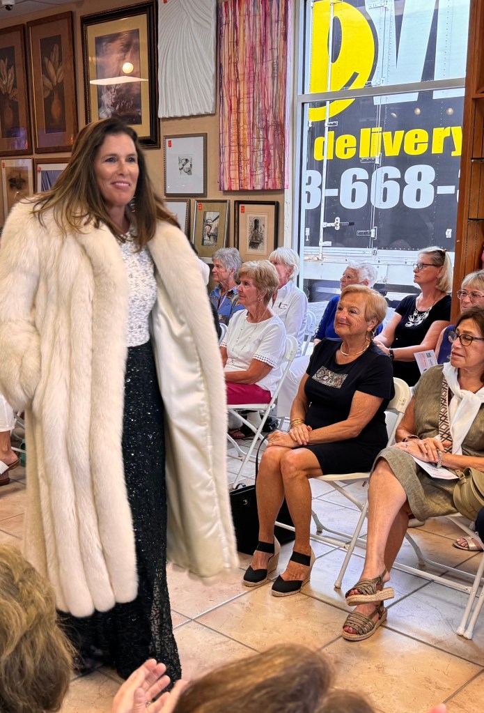 As you can see from the big grin on my face I was not exuding any of the cool, chic detachment of professional runway models. The crowd of 120+ ladies was warm, chatty and complimentary and included a couple dozen of our tennis pals, so it was all too much fun. Jodi stole the show, making a dramatic exit by flinging off her fur coat and dragging it across the floor. You can check her out in the video below (it’s a little fuzzy). Well played Jodi!