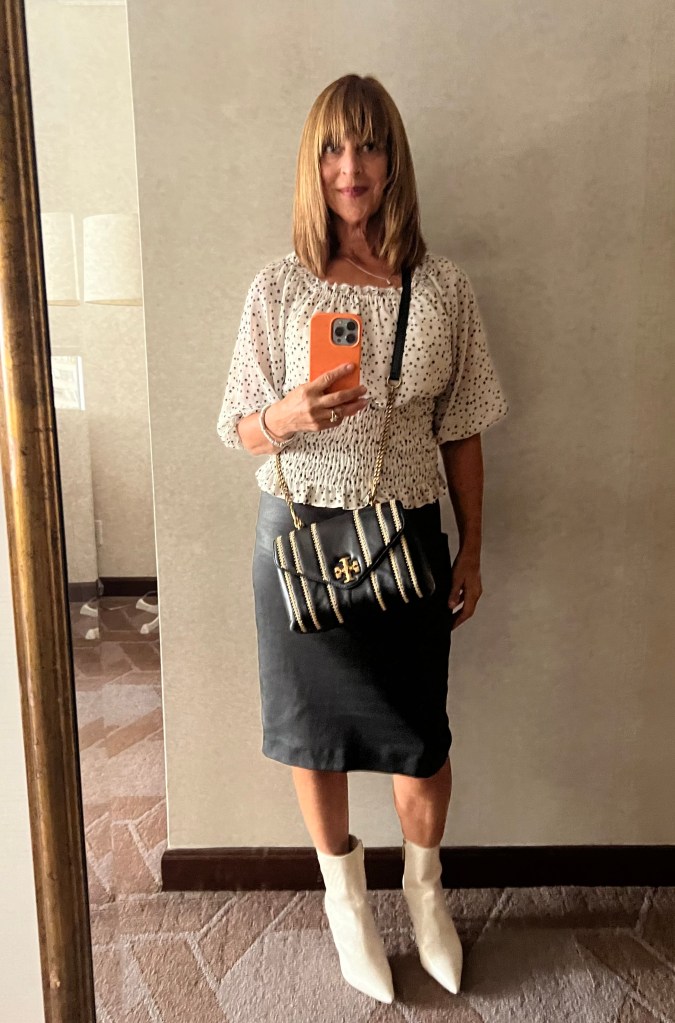 - Sophisticated. With booties, a stretchy leather skirt and a ladylike bag, I was ready for a swanky night out in New York City.