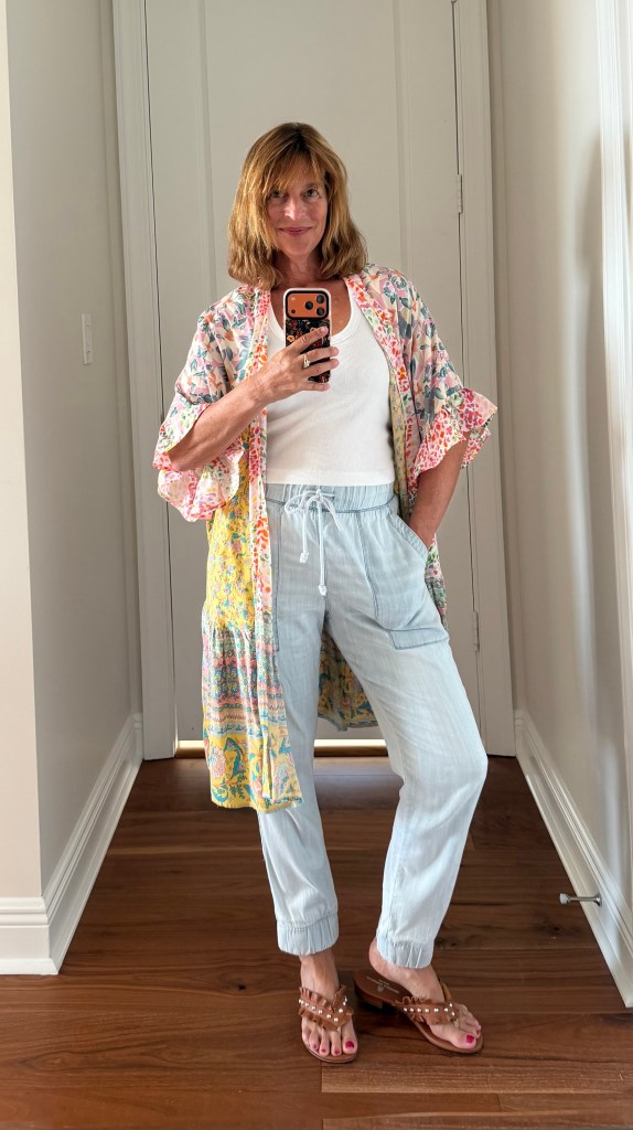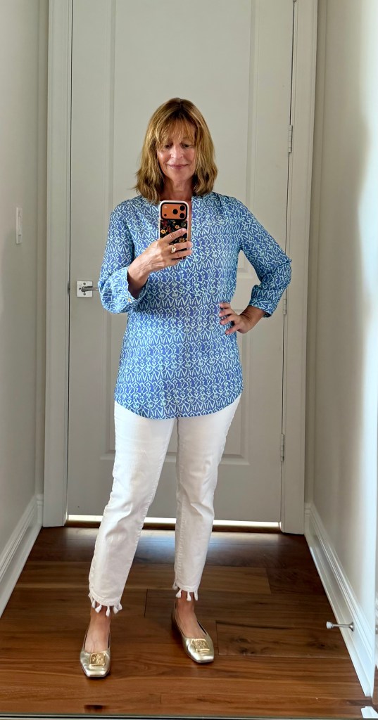 Take the blue silk tunic below for example. I like the color, weight and feeling of the piece, but I never felt great in it. When you look at the photo, you can see that the tunic hits me across the hips and takes up about the same amount of my vertical body as the white pants, giving a 50:50 ratio.