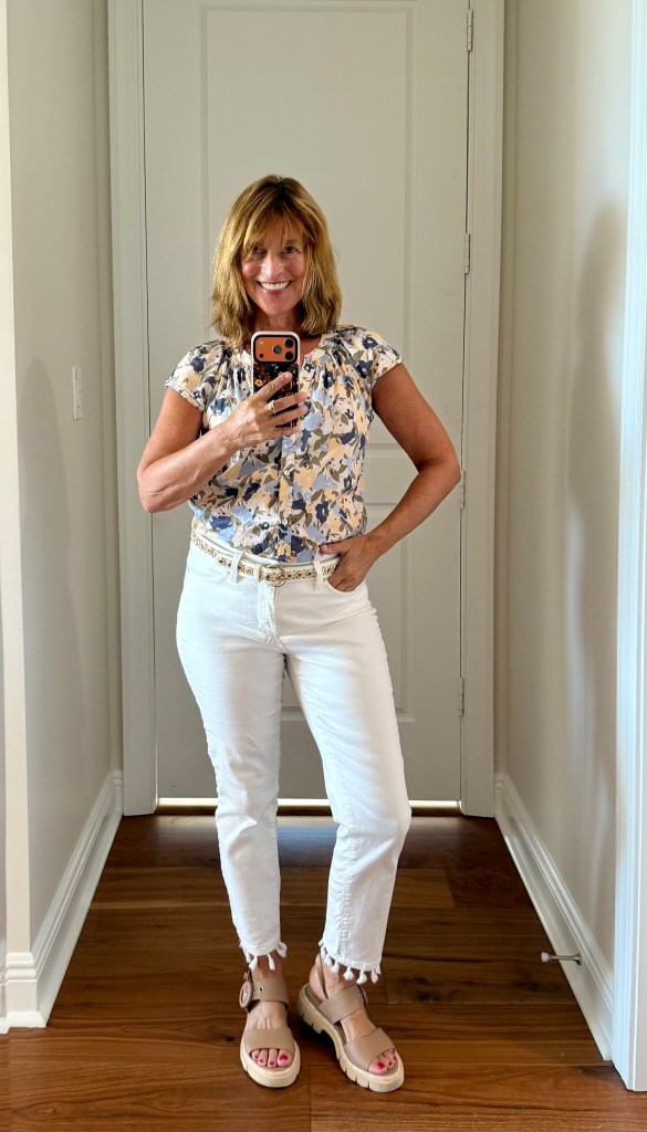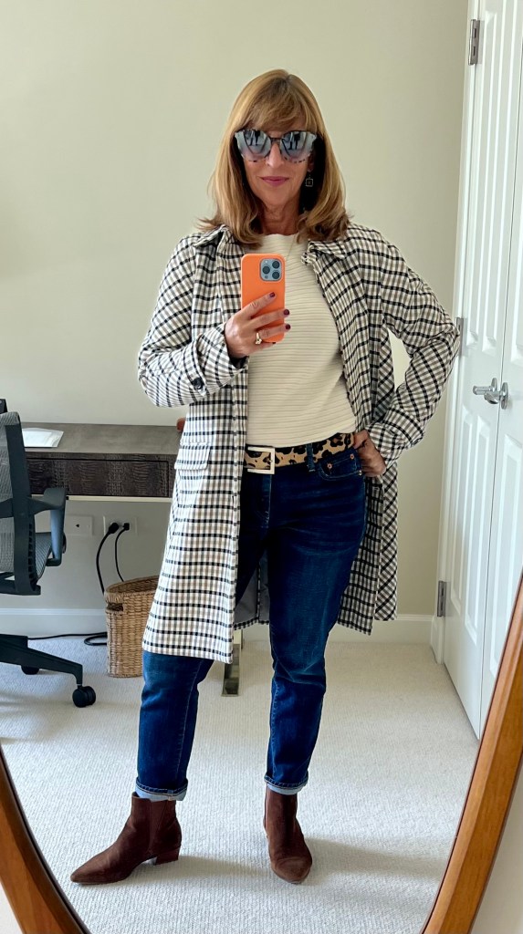 Compare the photo on the left to the similar outfit on the right with the top tucked in and a belt. Now the focal point is higher and the ratio is closer to 1/3 top, 2/3 pants. It’s more visually pleasing, don’t you think?