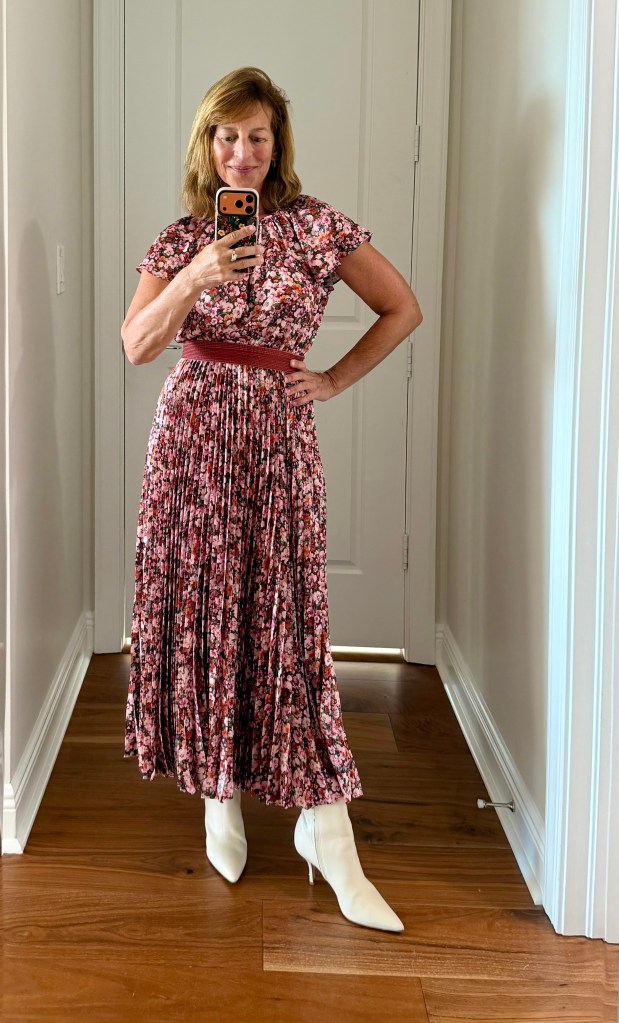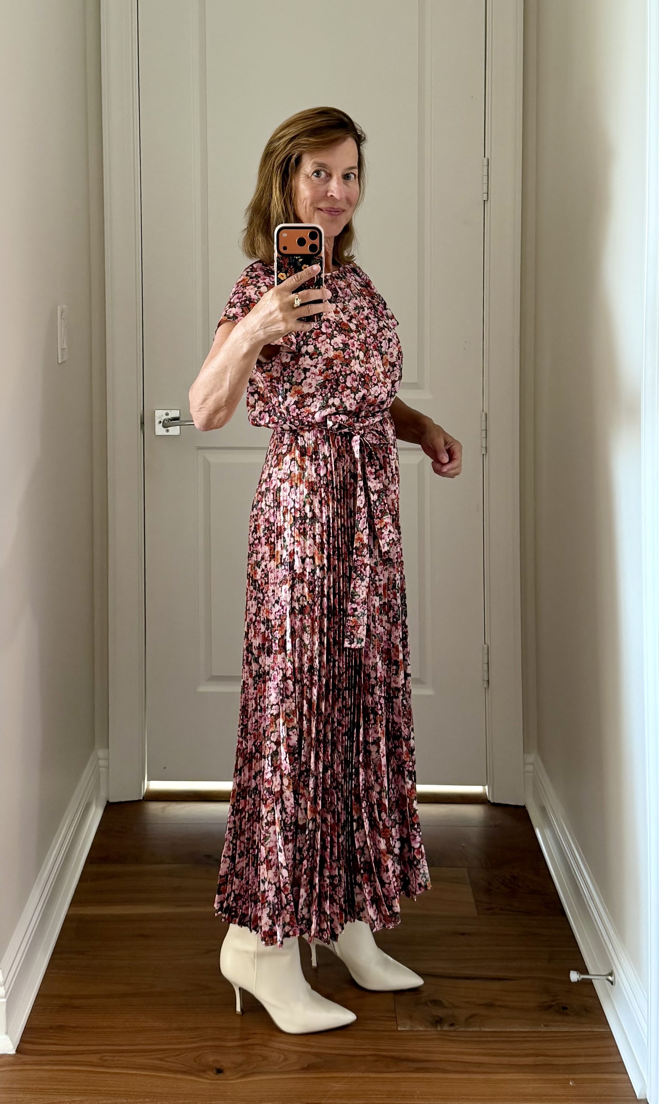 I’m only 5’3″, so it’s easy to be overwhelmed by longer dresses. I’m kind of lost in the sweeping pattern of the dress below. Just adding the contrasting belt at the 1/3 mark makes a big difference to how this dress looks, even though the fit is exactly the same.