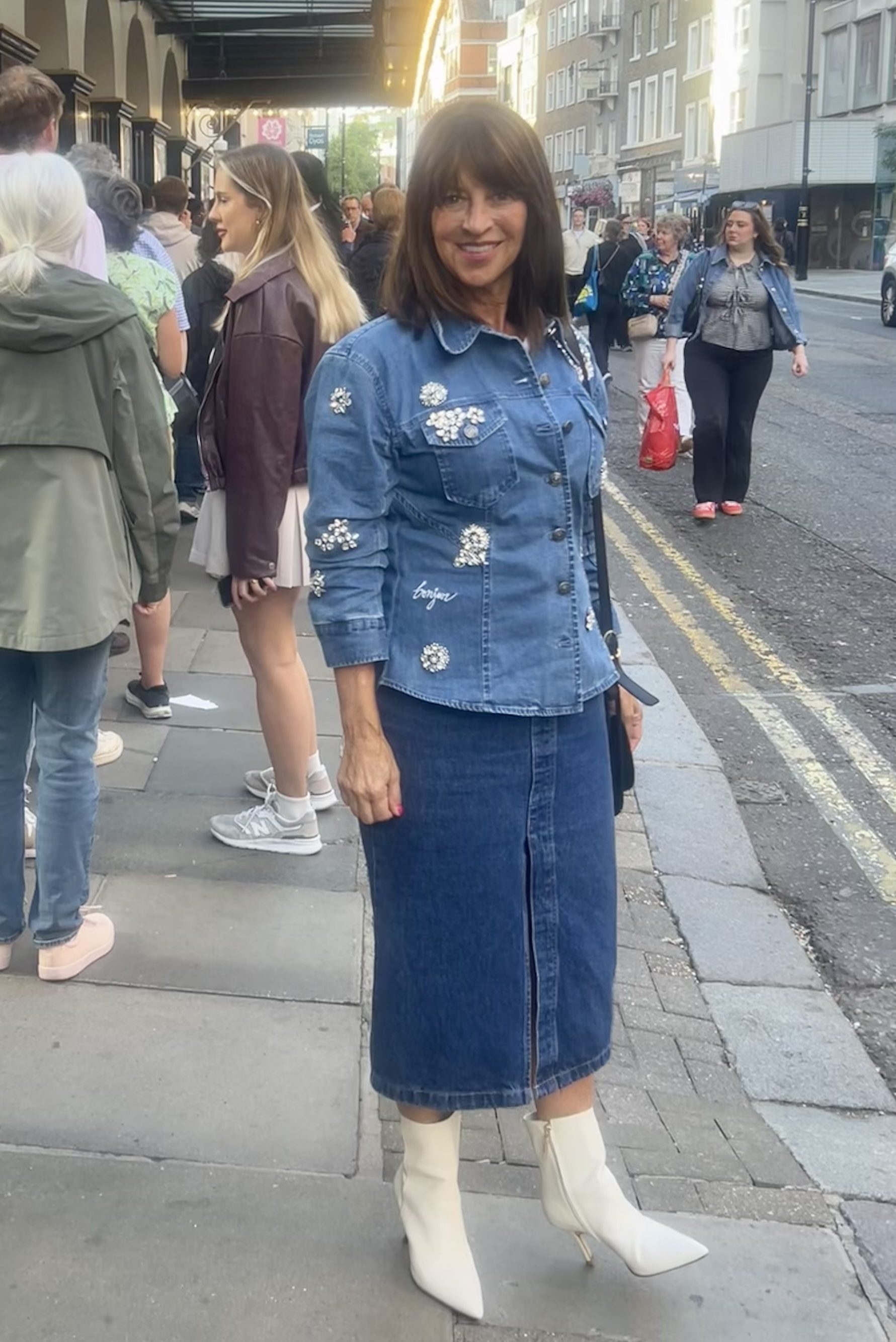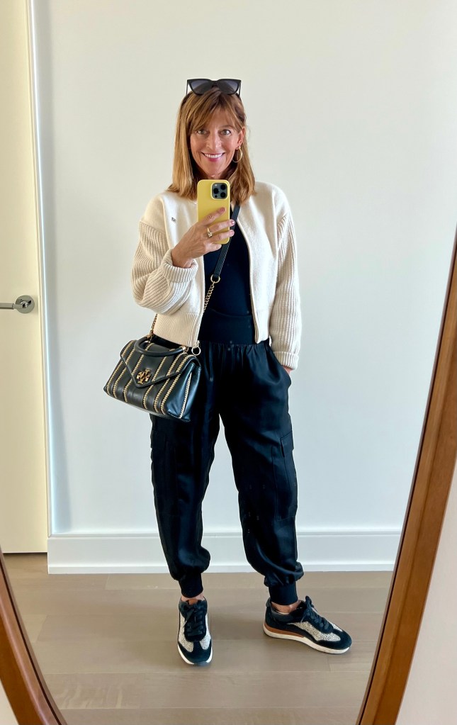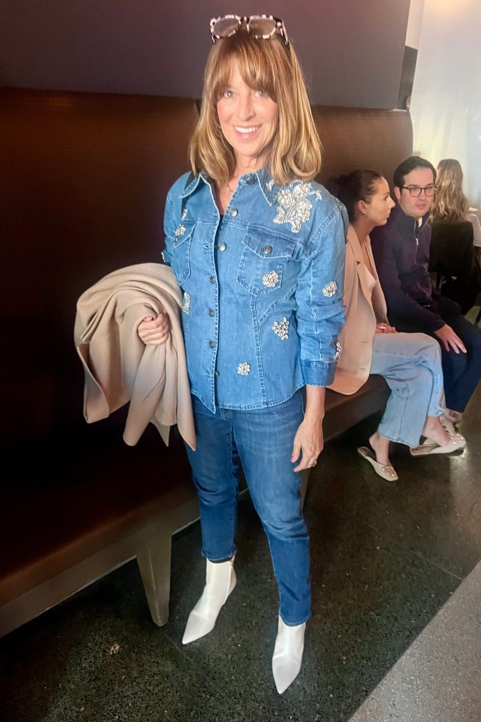 You can adjust proportions by wearing things longer as well. The sequined jacket below looks much more balanced with the longer jeans than it does with the midi skirt.