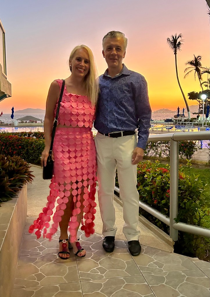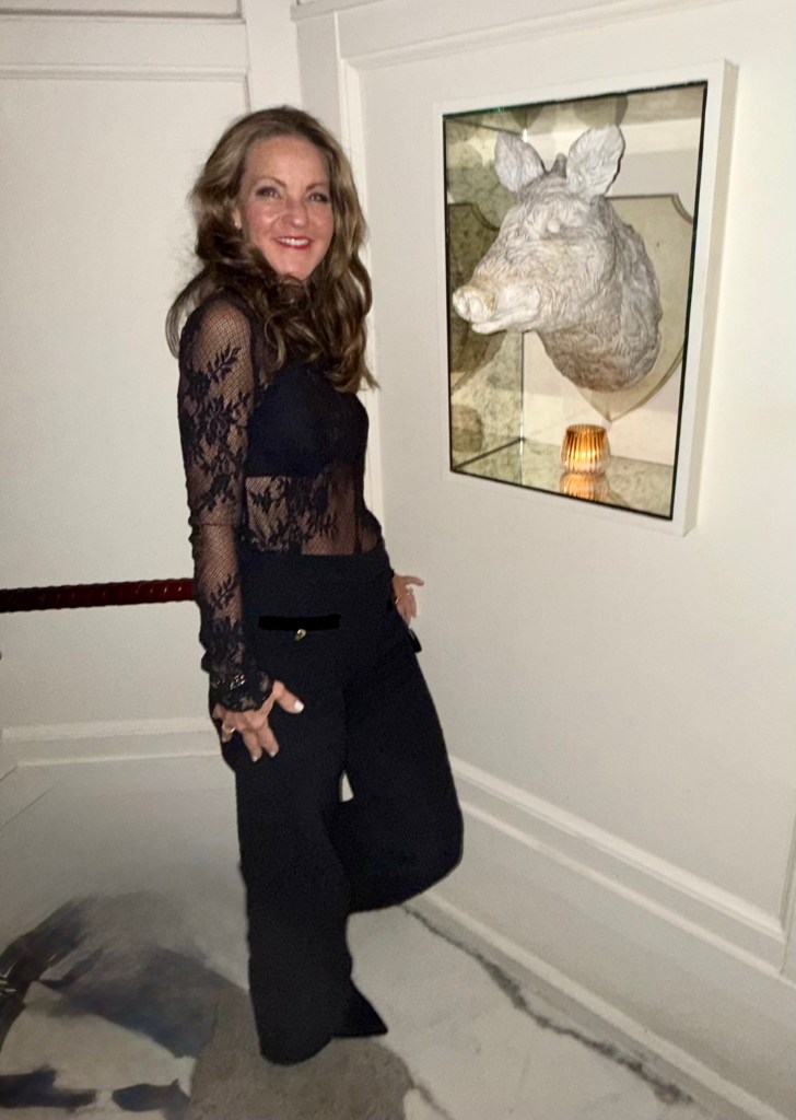 Berit, from Minneapolis and a frequent contributor here, is a true fashionista. She considers getting dressed up an endless source of creativity and a way to fully celebrate life. “I think half the fun in going to parties or events lies in finding the perfect outfit to match the occasion,” she says. “Having opportunities to dress up is an occasion to try to look extra “good” and to go beyond the ordinary/mundane. During Covid, It was really quite debilitating mentally to not have anything to look forward to, to dress for.” She also sees travel as an opportunity to experiment with different styles and trends and constantly looks for new inspiration. Here’s a chic, sheer outfit she wore to dinner out in Manhattan, based on a similar outfit she saw on Instagram.